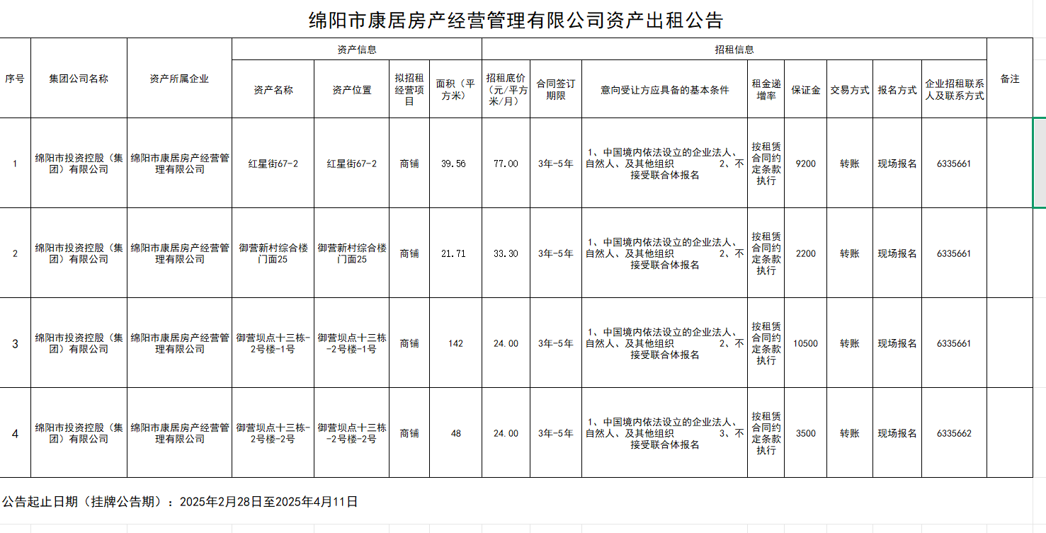 綿陽市康居房產(chǎn)經(jīng)營(yíng)管理有限公司資產(chǎn)出租公告