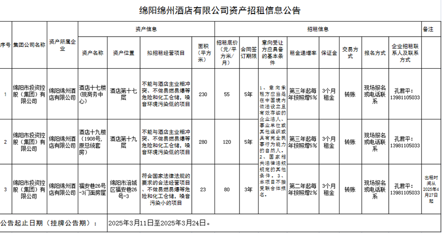 綿陽綿州酒店有限公司資產招租信息公告