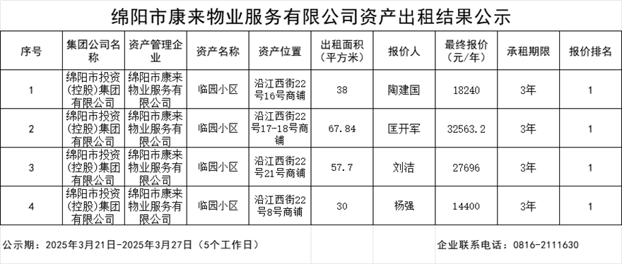 綿陽市康來物業(yè)服務(wù)有限公司資產(chǎn)出租結(jié)果公示