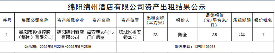綿陽綿州酒店有限公司資產(chǎn)出租結(jié)果公示