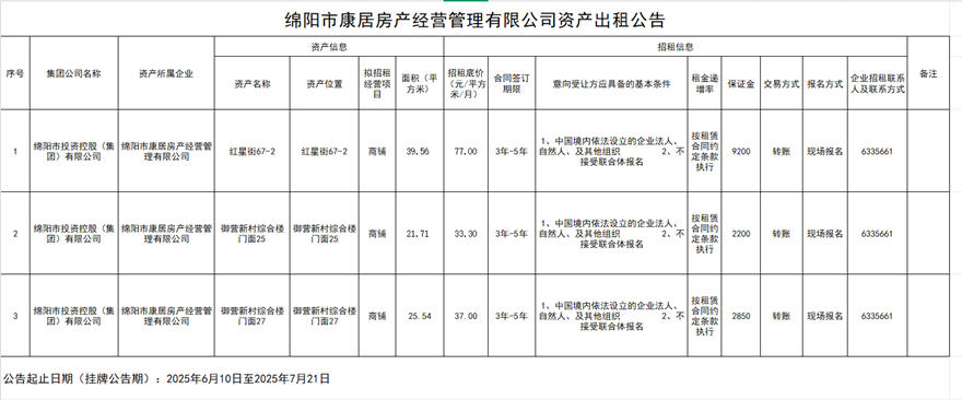 綿陽市康居房產(chǎn)經(jīng)營管理有限公司資產(chǎn)出租公示