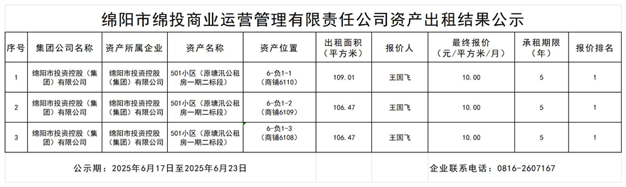 綿陽(yáng)市綿投商業(yè)運(yùn)營(yíng)管理有限責(zé)任公司資產(chǎn)出租結(jié)果公示