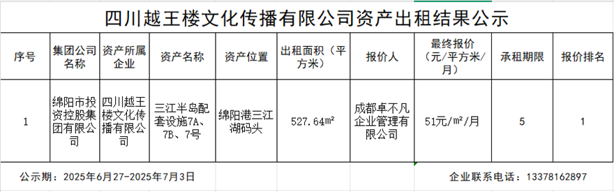 四川越王樓文化傳播有限公司資產(chǎn)出租結果公示