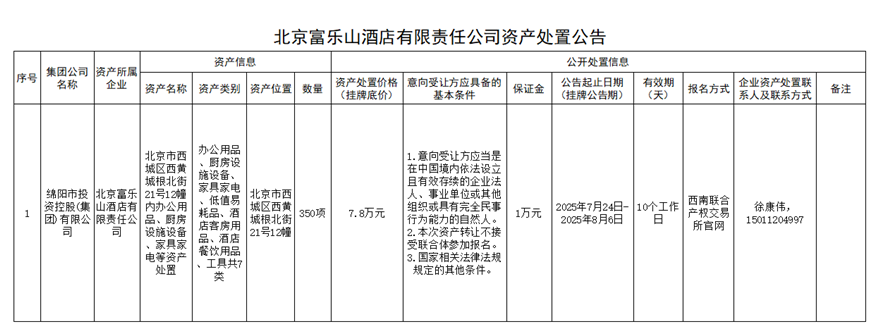 北京富樂山酒店有限責(zé)任公司資產(chǎn)處置公告