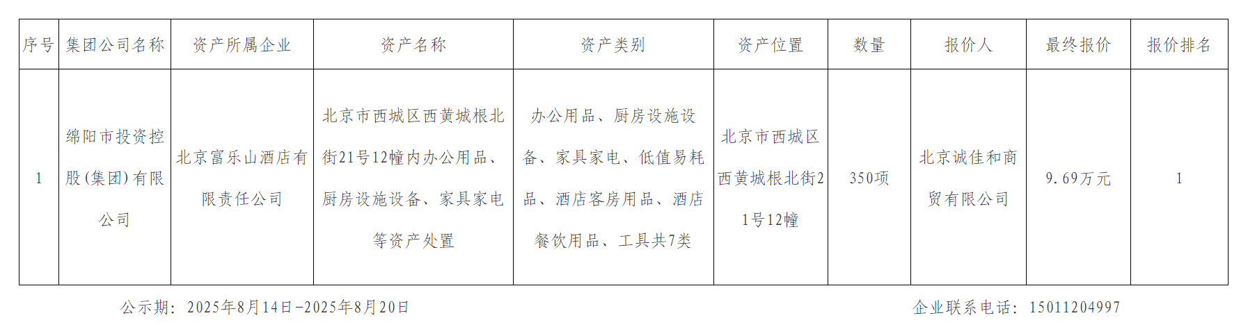 北京富樂山酒店有限責(zé)任公司資產(chǎn)處置結(jié)果公示
