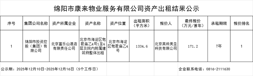 綿陽市康來物業(yè)服務(wù)有限公司資產(chǎn)出租結(jié)果公示