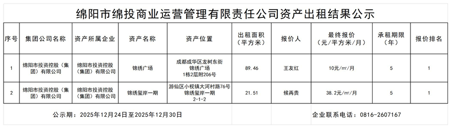 綿陽(yáng)市綿投商業(yè)運(yùn)營(yíng)管理有限責(zé)任公司資產(chǎn)出租結(jié)果公示