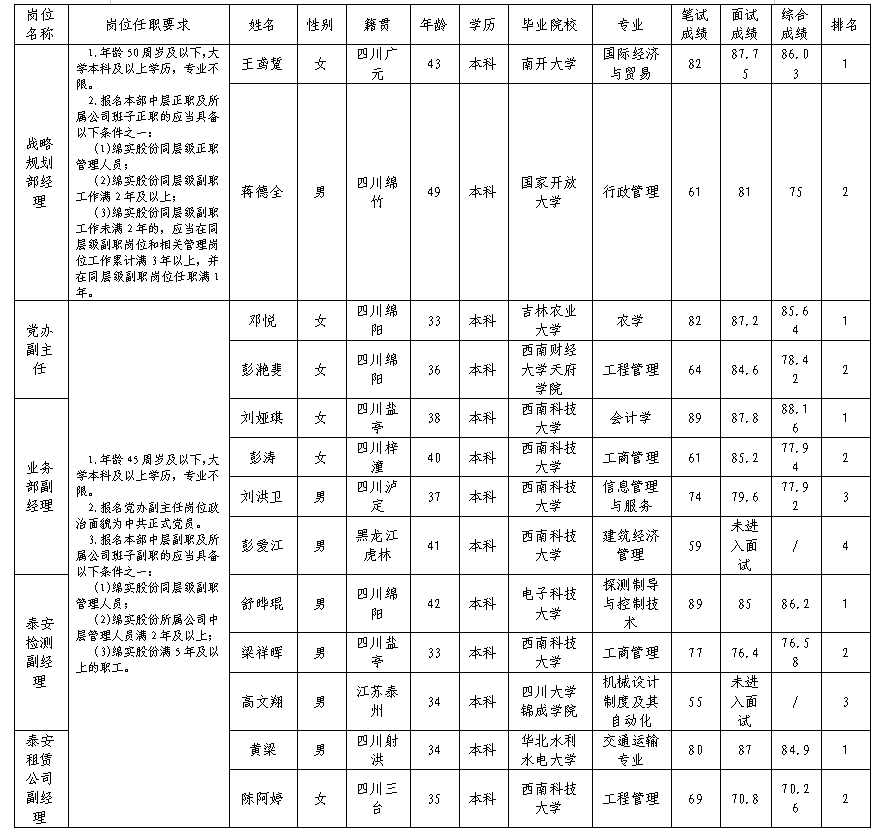 根據(jù)綿陽市汽車實驗駕駛技術(shù)學(xué)校股份有限公司發(fā)布的內(nèi)部競聘公告及內(nèi)部競聘相關(guān)規(guī)定,經(jīng)筆試、面試等程序,現(xiàn)將內(nèi)部競聘成績予以公示。