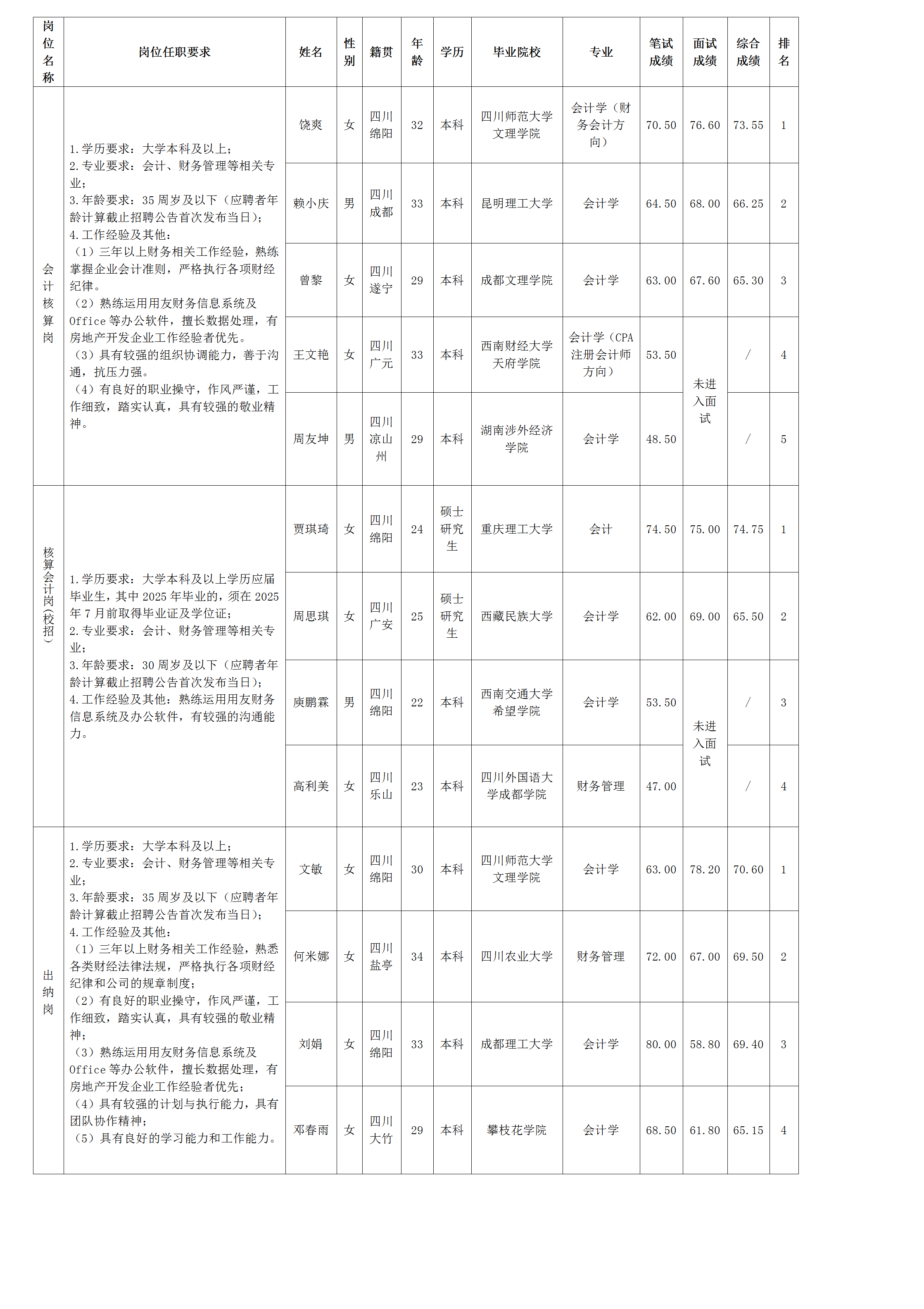 根據(jù)綿陽市綿投置地有限公司發(fā)布的招聘公告及招聘相關(guān)規(guī)定,經(jīng)筆試、面試等程序,現(xiàn)將筆試、面試成績予以公示。