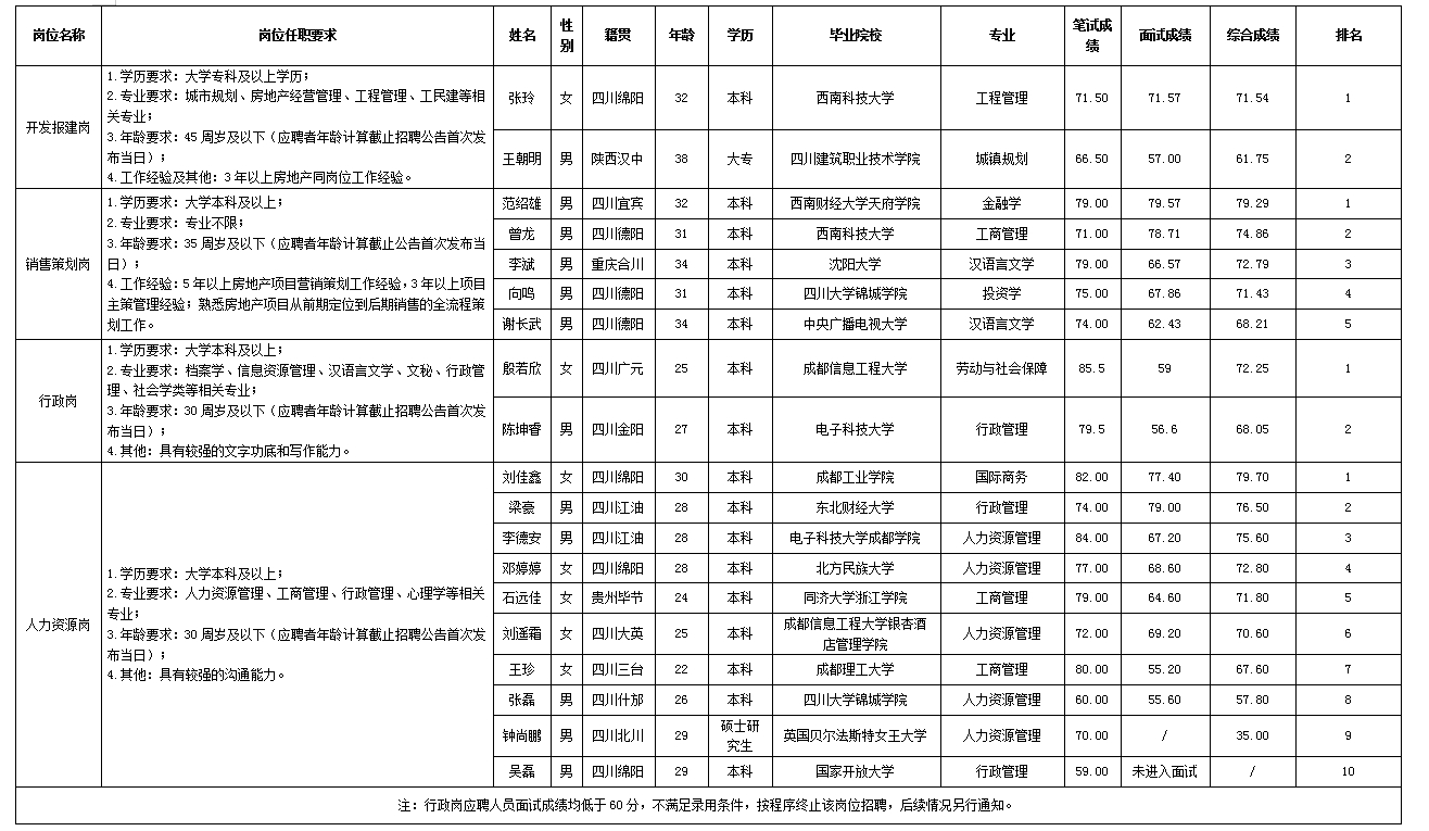 根據(jù)綿陽市綿投置地有限公司發(fā)布的招聘公告及招聘相關(guān)規(guī)定,經(jīng)筆試、面試等程序,現(xiàn)將筆試面試成績予以公示。