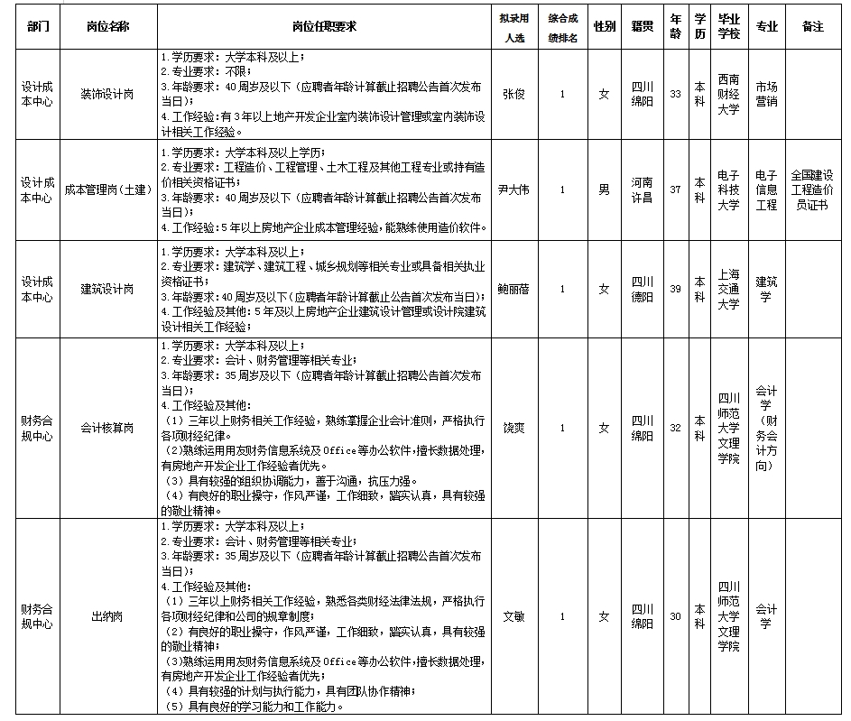 根據(jù)綿陽市綿投置地有限公司發(fā)布的招聘公告及招聘相關(guān)規(guī)定,經(jīng)筆試、面試、考察、體檢等程序,擬錄用張俊等5名同志到綿陽市綿投置地有限公司工作,現(xiàn)予以公示,具體情況如下: