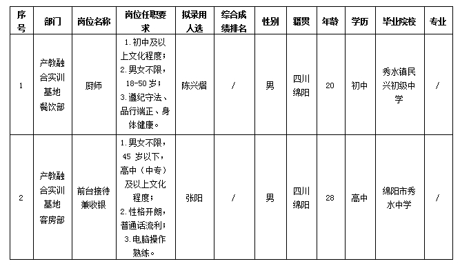 根據(jù)綿陽(yáng)市綿州嘉來(lái)會(huì)務(wù)服務(wù)有限公司發(fā)布的招聘公告及招聘相關(guān)規(guī)定,經(jīng)面試、體檢等程序,擬錄用陳興熠、張陽(yáng)同志到產(chǎn)教融合實(shí)訓(xùn)基地餐飲部、客房部工作,現(xiàn)予以公示,具體情況如下: