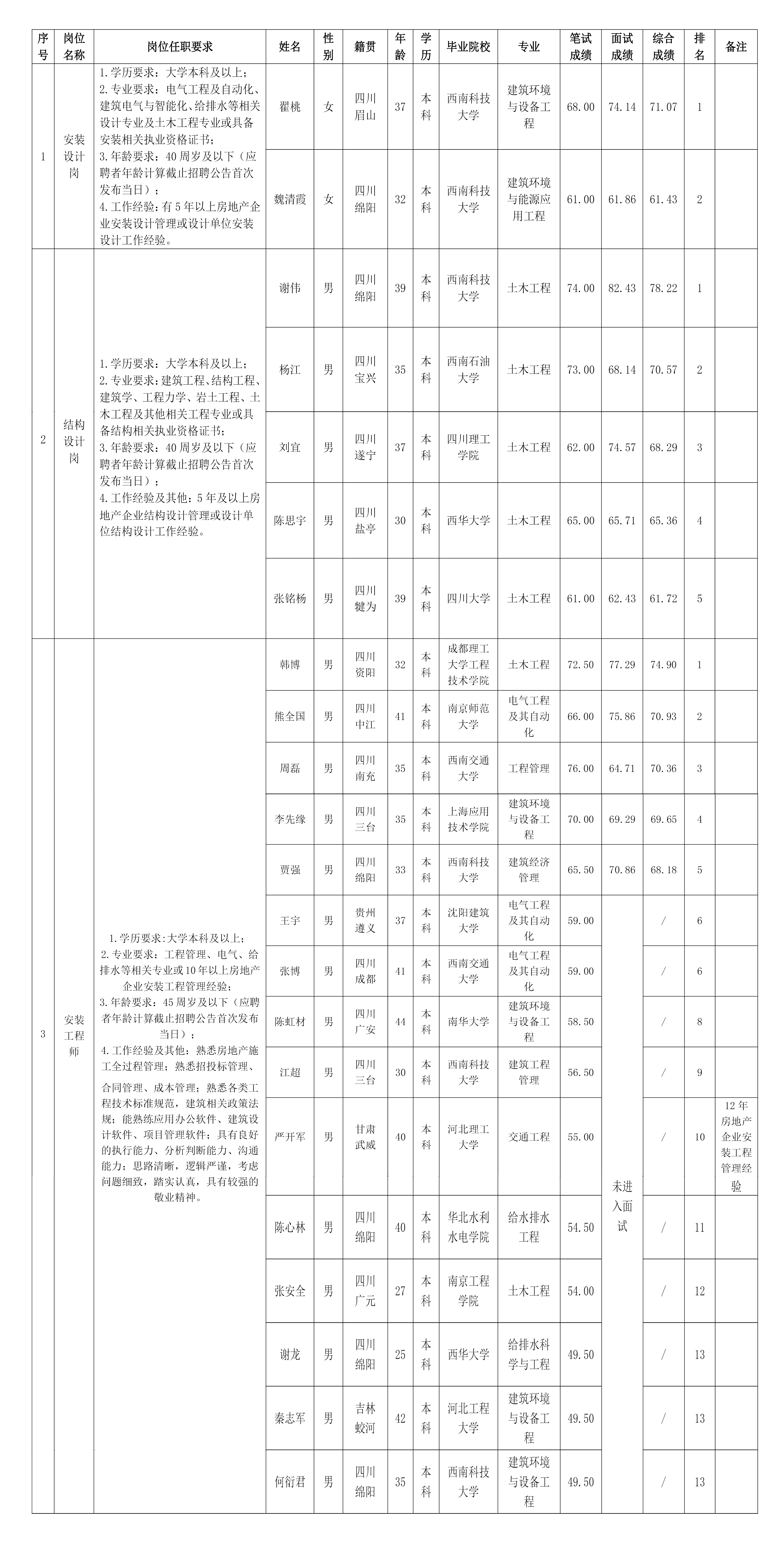根據(jù)綿陽市綿投置地有限公司發(fā)布的招聘公告及招聘相關(guān)規(guī)定,經(jīng)筆試、面試等程序,現(xiàn)將筆試、面試成績予以公示。