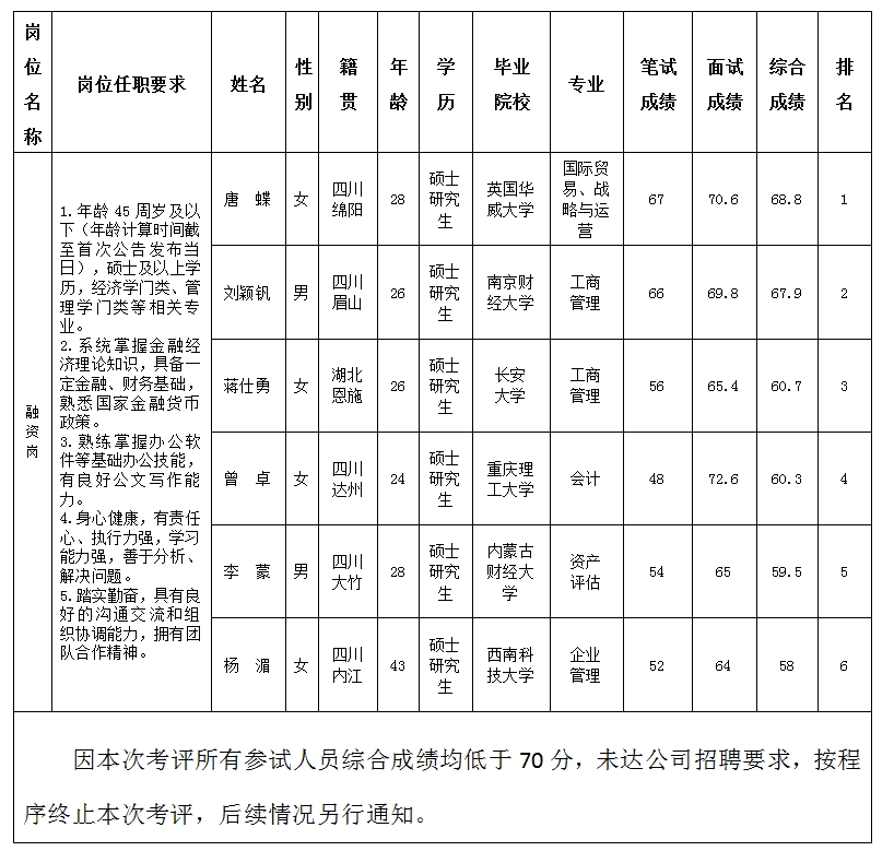 根據(jù)綿陽(yáng)金控投資管理有限責(zé)任公司發(fā)布的招聘公告及招聘相關(guān)規(guī)定,經(jīng)筆試、面試等程序,現(xiàn)將筆試(面試)成績(jī)予以公示。