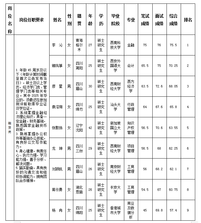 根據(jù)綿陽金控投資管理有限責(zé)任公司發(fā)布的招聘公告及招聘相關(guān)規(guī)定,經(jīng)筆試、面試等程序,現(xiàn)將筆試(面試)成績予以公示。