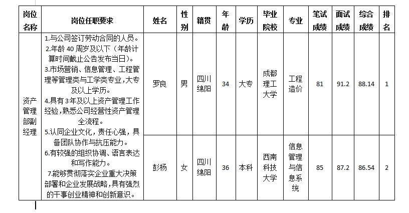根據(jù)綿陽市綿投商業(yè)運(yùn)營(yíng)管理有限責(zé)任公司發(fā)布的競(jìng)聘公告及競(jìng)聘相關(guān)規(guī)定,經(jīng)筆試、面試等程序,現(xiàn)將筆試(面試)成績(jī)予以公示。