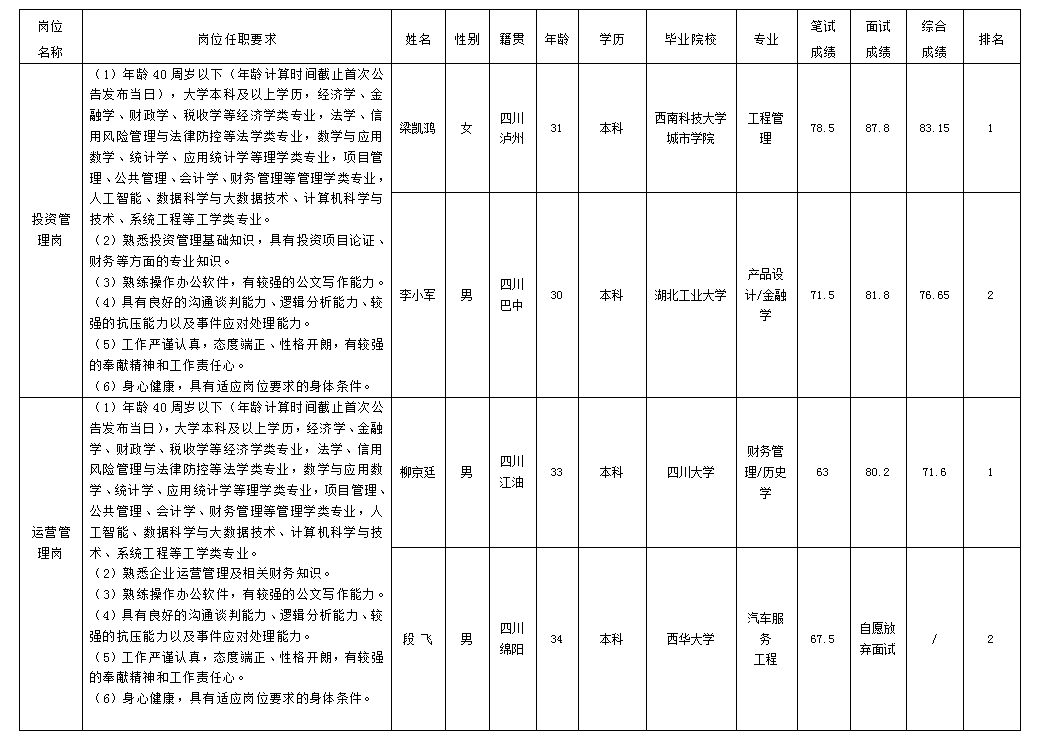 根據(jù)綿陽市投資控股(集團)有限公司發(fā)布的招聘公告及招聘相關(guān)規(guī)定,經(jīng)筆試、面試等程序,現(xiàn)將筆試(面試)成績予以公示。