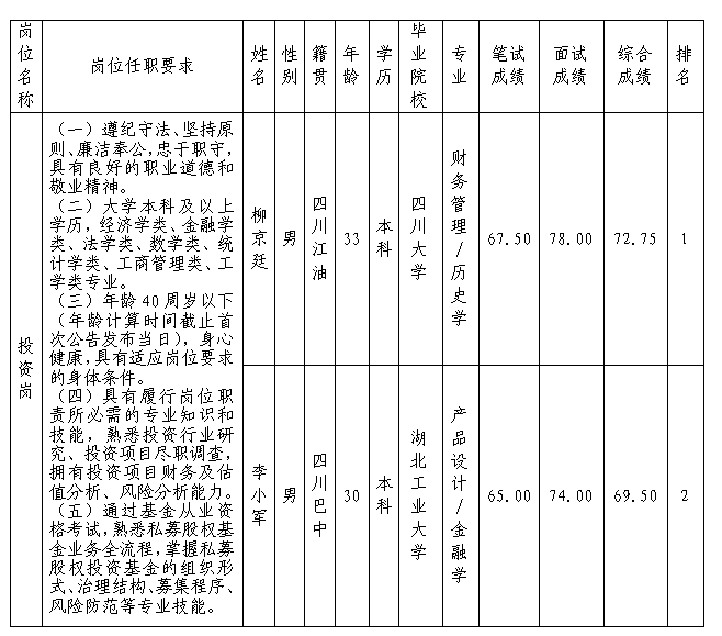 根據(jù)綿陽(yáng)綿投私募基金管理有限公司發(fā)布的招聘公告及招聘相關(guān)規(guī)定,經(jīng)筆試、面試等程序,現(xiàn)將內(nèi)部選聘成績(jī)予以公示。