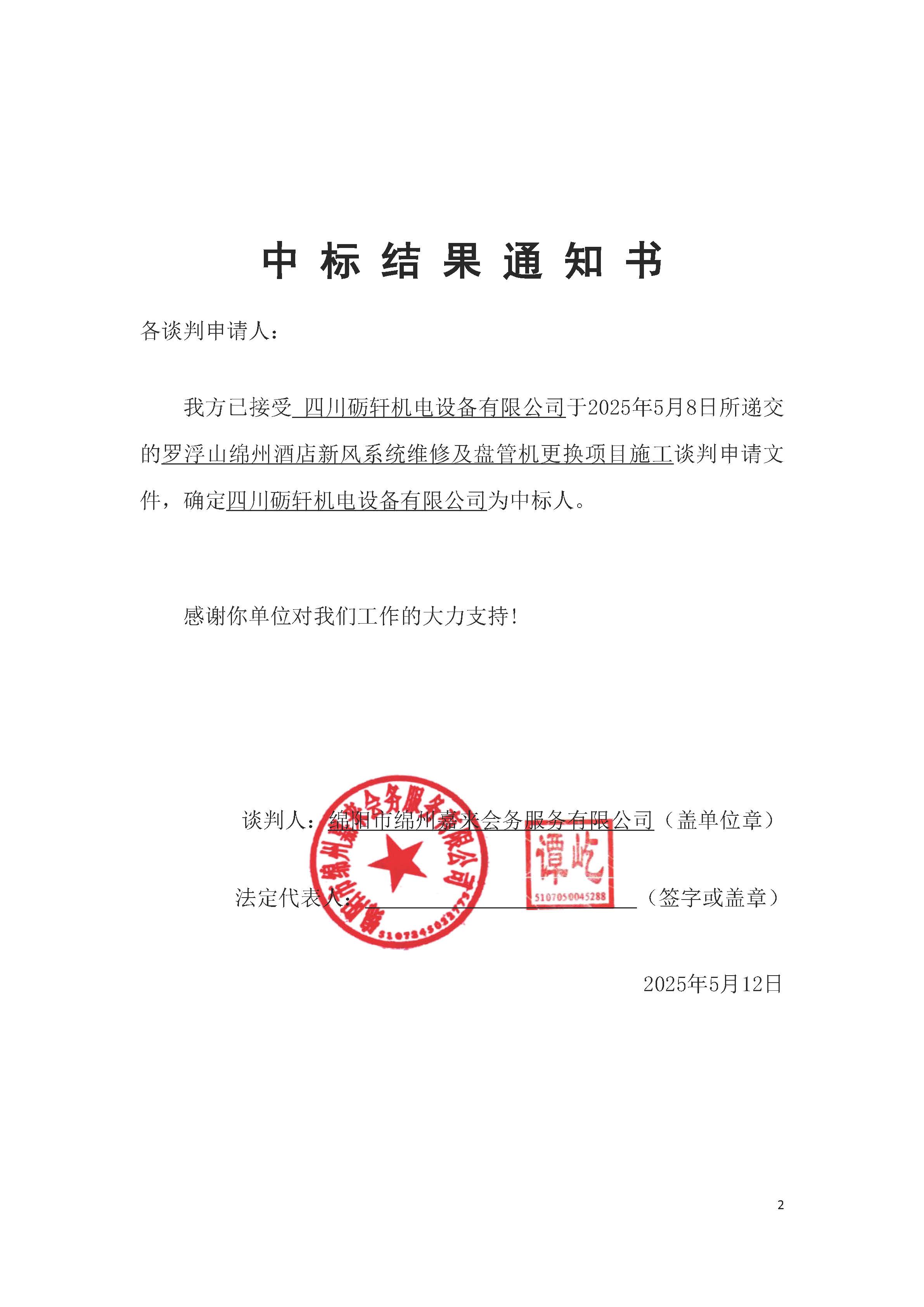 羅浮山綿州酒店新風(fēng)系統(tǒng)維修及盤(pán)管機(jī)更換項(xiàng)目施工中標(biāo)結(jié)果通知