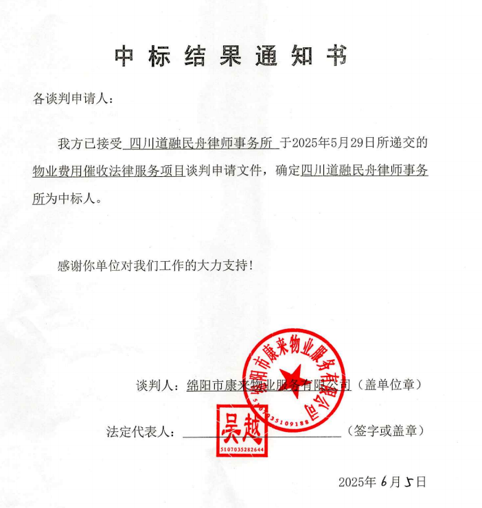 物業(yè)費用催收法律服務(wù)項目中標(biāo)結(jié)果通知書