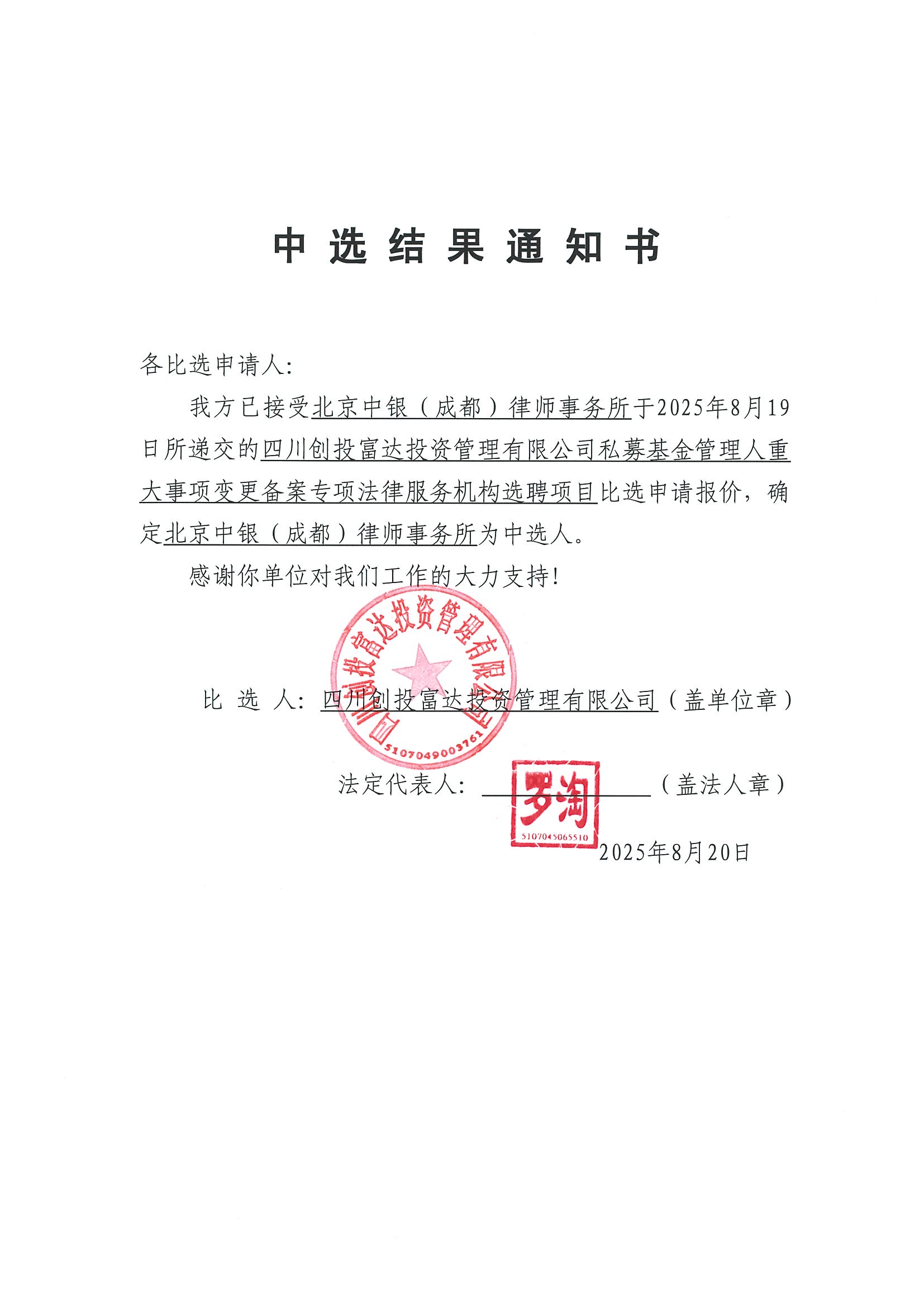 創(chuàng)投富達私募基金管理人重大事項變更備案專項法律服務(wù)機構(gòu)選聘中選結(jié)果通知