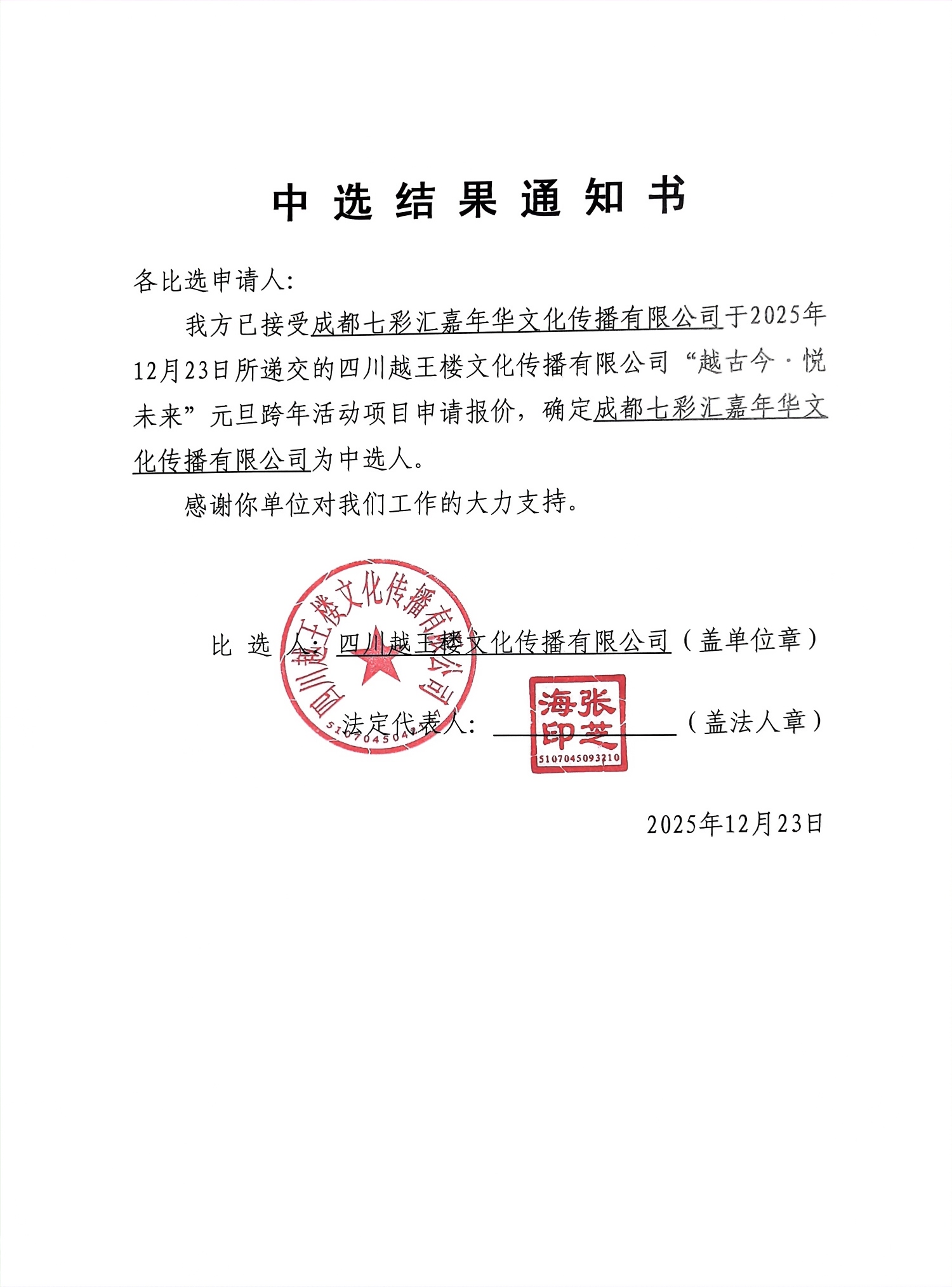 四川越王樓文化傳播有限公司“越古今·悅未來”元旦跨年活動項目中選結(jié)果公告
