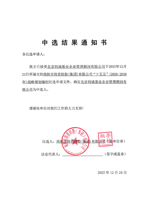 綿陽(yáng)市投資控股(集團(tuán))有限公司“十五五”(2026-2030年)戰(zhàn)略規(guī)劃編制中選結(jié)果通知