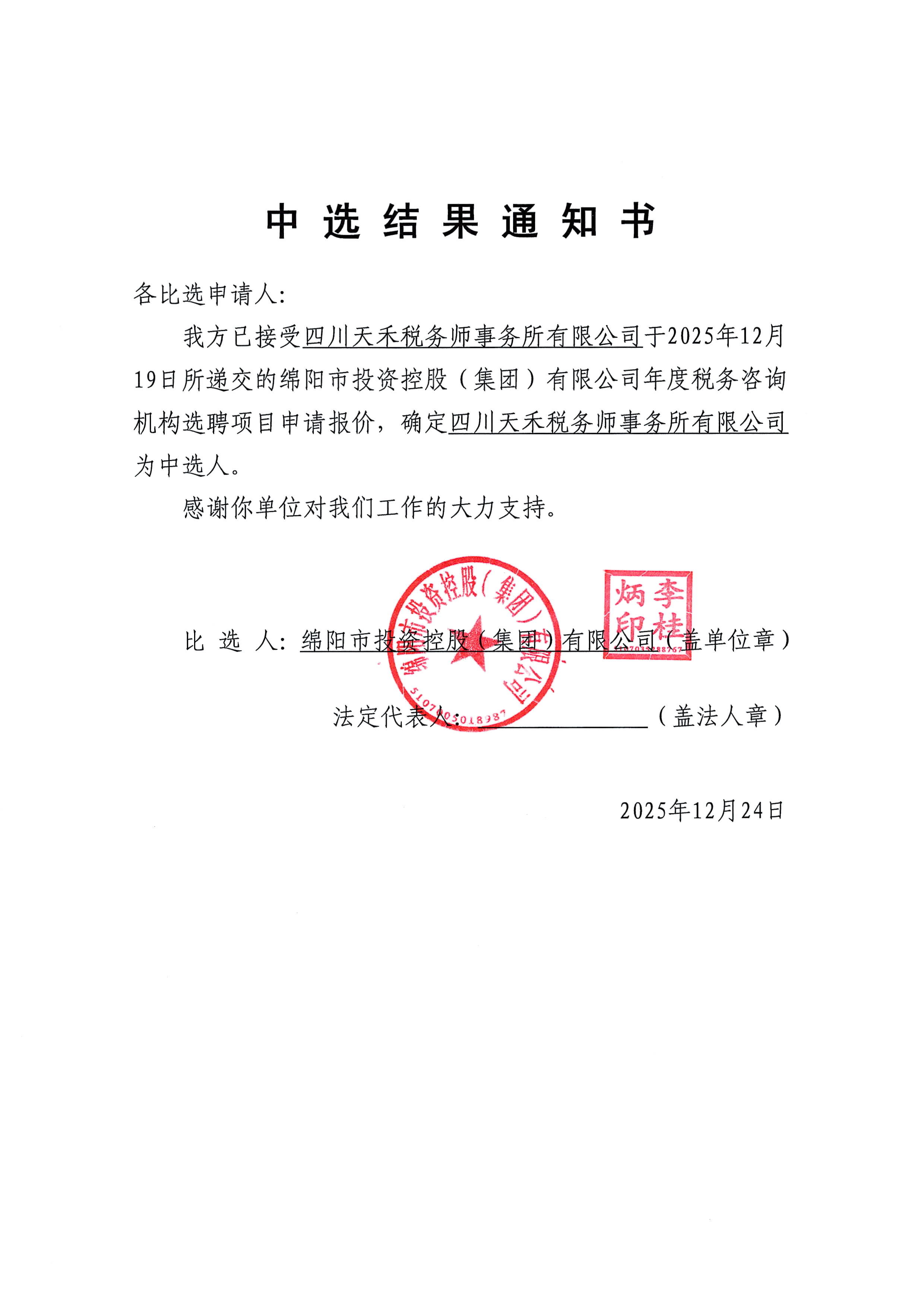 綿陽市投資控股(集團)有限公司年度稅務咨詢機構選聘項目中選結果通知