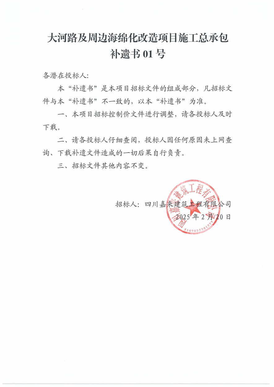 大河路及周邊海綿化改造項(xiàng)目施工總承包補(bǔ)遺書01號