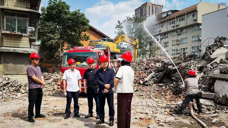 危房緊鄰周邊住宅,施工空間狹小,拆除難度極大。為確保拆除工作安全有序進(jìn)行,富達(dá)公司多次組織建筑、安全專家現(xiàn)場(chǎng)勘查,研究制定了“機(jī)械拆除為主,人工配合為輔”的精細(xì)化拆除方案。拆除現(xiàn)場(chǎng),工作人員設(shè)置警戒線封鎖拆除區(qū)域,專人疏導(dǎo)圍觀群眾,維護(hù)現(xiàn)場(chǎng)秩序。伴隨著挖掘機(jī)的轟鳴聲,危房樓體結(jié)構(gòu)在專業(yè)人員的精準(zhǔn)操控下逐步瓦解,同步實(shí)施灑水降塵措施,整個(gè)拆除過(guò)程安全、有序、環(huán)保。